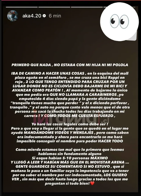Otro punto que generó controversia fue la afirmación del artista respecto a lo ocurrido tras el atropello. Según su versión, el repartidor le habría solicitado no llamar a Carabineros, indicando que se encontraba en situación migratoria irregular.