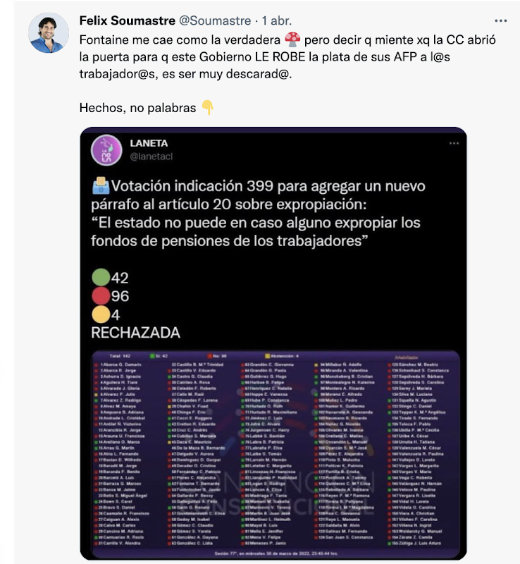 El periodista y ex chico Reality, Felix Soumastre, está en picada contra la Convención. En su canal de Twitter @Soumastre dedica ácidos comentarios al Gobierno del Presidente Gabriel Boric y muy especialmente al grupo de los 155 que escribe la propuesta de una Nueva Constitución.