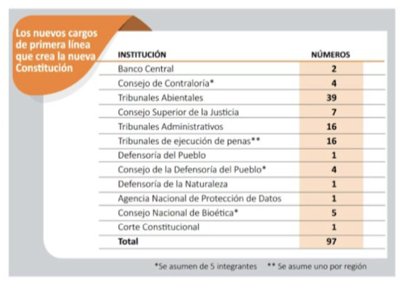 Una alarmante proyección publicó el Diario La Segunda, que estima que alrededor de 100 cargos nuevos de alto nivel jerárquico se crearían de aprobarse el borrador de la Nueva Constitución. La mayoría de los nuevos cargos se los llevarían los miembros de los nuevos tribunales ambientales, ya que pasarán de ser 3 a uno por región, y también los nuevos tribunales administrativos y de ejecución de penas que se crearían.