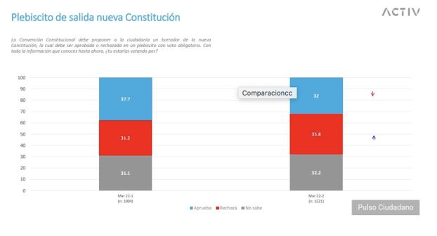 Sin embargo, las últimas mediciones han sido categóricas en marcar un punto de inflexión, dándole evidente ventaja al Rechazo por sobre el Apruebo. Hipótesis para explicar la baja en la adhesión a la opción del Apruebo hay varias, entre ellas, la rapidez con la que se han difundido algunos articulados que estarán presentes en la versión definitiva que se presentará a la ciudadanía el próximo septiembre, incluyendo una falta de definición sobre la propiedad de los fondos de pensiones, y otros relativos a diversos sistemas de justicia, distinto para personas de pueblos originarios en relación al resto de los ciudadanos.