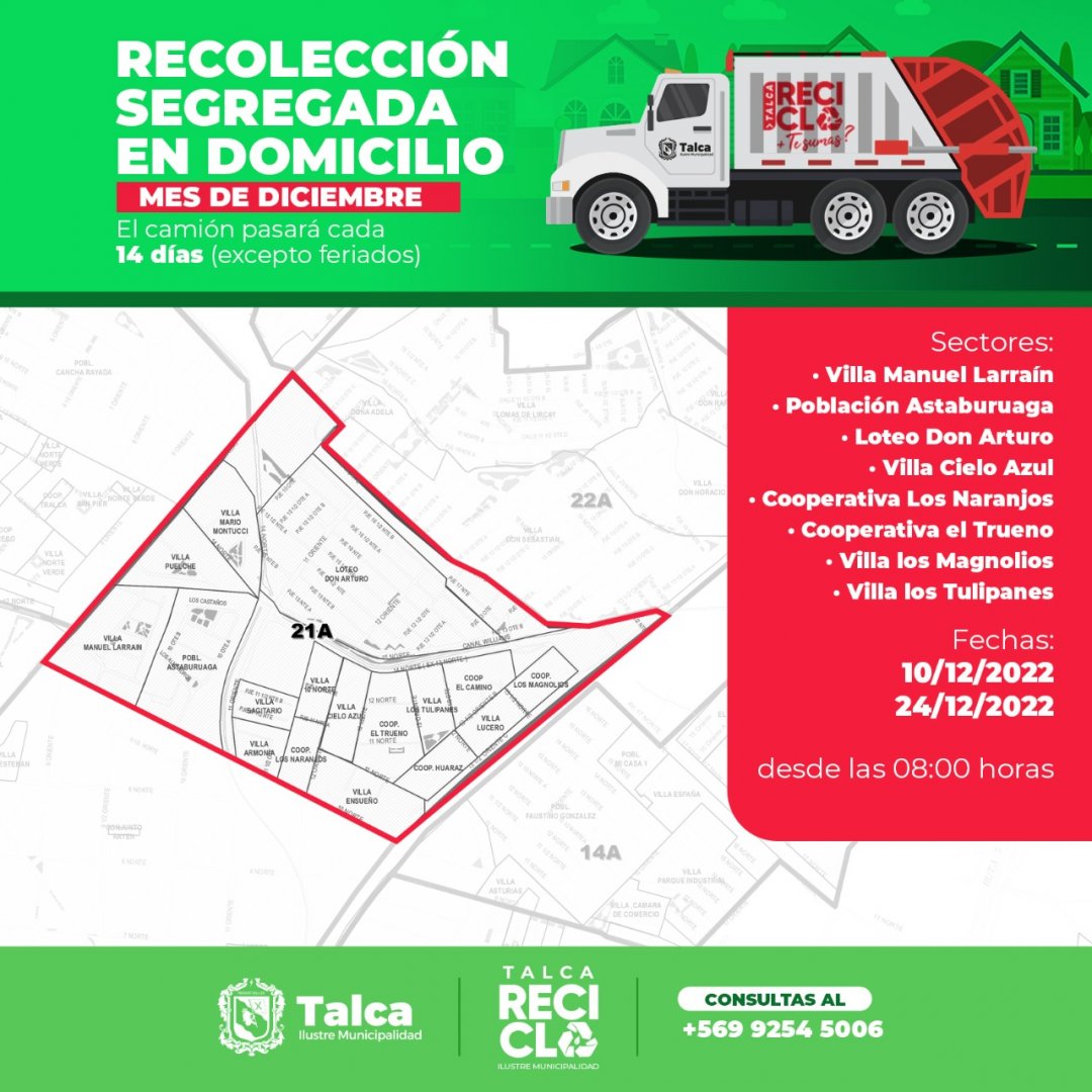 Mañana sábado 10 de diciembre el camión recolector pasará recogiendo en algunos sectores de la ciudad de Talca elementos de reciclaje del hogar como: papel, cartón, plásticos PET y vidrios.