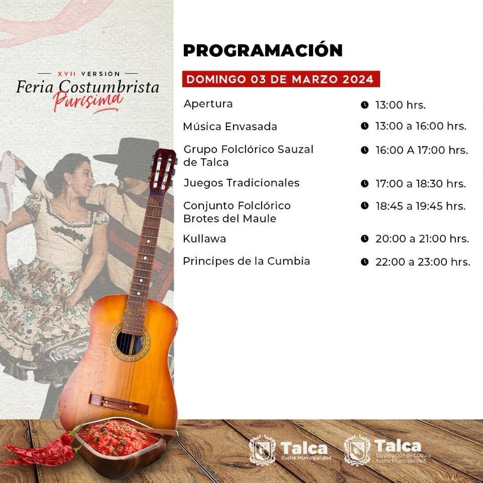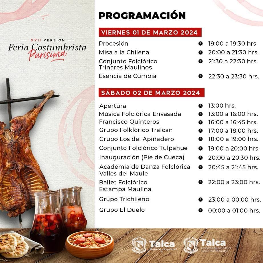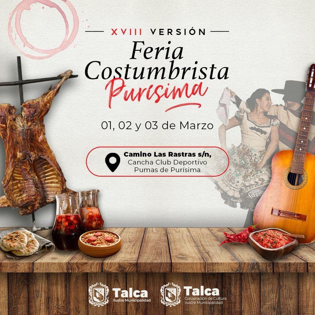 La Ilustre Municipalidad de Talca, a través de su Corporación Municipal de Cultura y, la Junta de Vecinos de Purísima, realizarán, este fin de semana, la XVIII versión de la Feria Costumbrista Purísima.