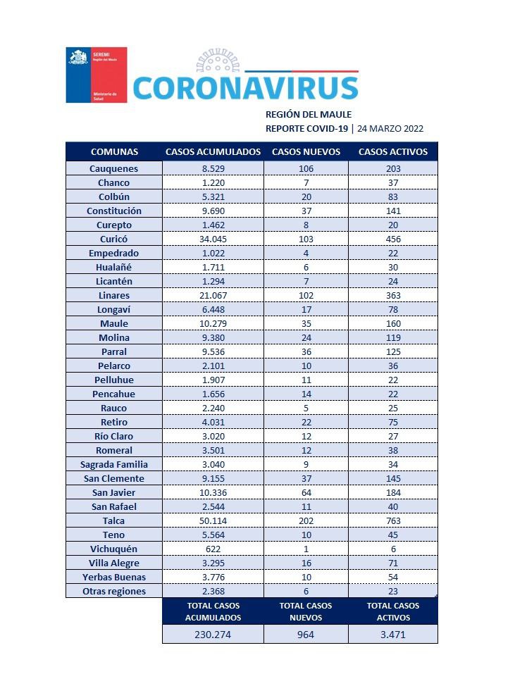 En un nuevo informe sobre la situación del Covid-19 en el Maule, desde la Seremi de Salud expusieron que en las últimas horas se registraron 964 nuevos casos, de los cuales, 564 presentaron síntomas y 300 fueron asintomáticos. Lo anterior, deja un total de 230.274 personas diagnosticadas con la enfermedad en la región desde que comenzó la pandemia. Con respecto a los fallecidos, se contabilizaron 24 nuevos decesos, lo que hace aumentar la cifra total de muertos a 2.773.