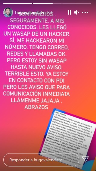 El comunicador que detalló que ya habría contactado a la PDI, igualmente solicitó ayuda a sus seguidores, para saber “cómo operar ante esta vulneració”. Además de lo anterior, Valencia aclaró que hasta nuevo aviso estará sin Whatsapp y solo recibiendo llamadas con su número.